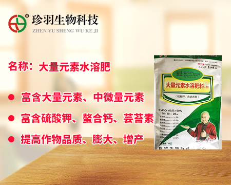 大量元素水溶肥料為經(jīng)水溶解或稀釋,用于灌溉施肥、葉面施肥、無土栽培、浸種蘸根等用途的液體或固體產(chǎn)品,可以葉面施肥、浸種蘸根、灌溉施肥,灌溉包括噴灌、滴灌等方式進(jìn)行灌溉時(shí)施肥,既節(jié)約用水,又節(jié)約施肥,而且還植物吸收快,大量元素水溶肥是一種可以完全溶于水的多元復(fù)合肥料,它能迅速地溶解于水中,更容易被作物吸收,而且其吸收利用率相對(duì)較高,我們看一下珍羽生物的大量水溶肥。